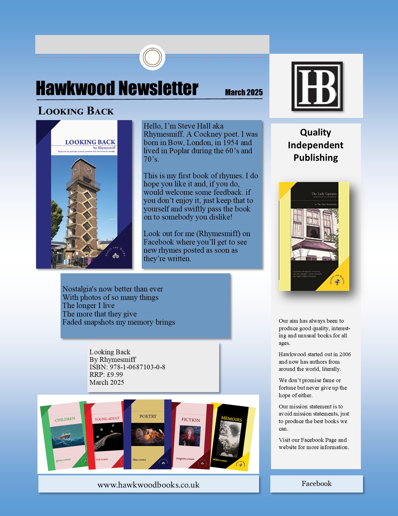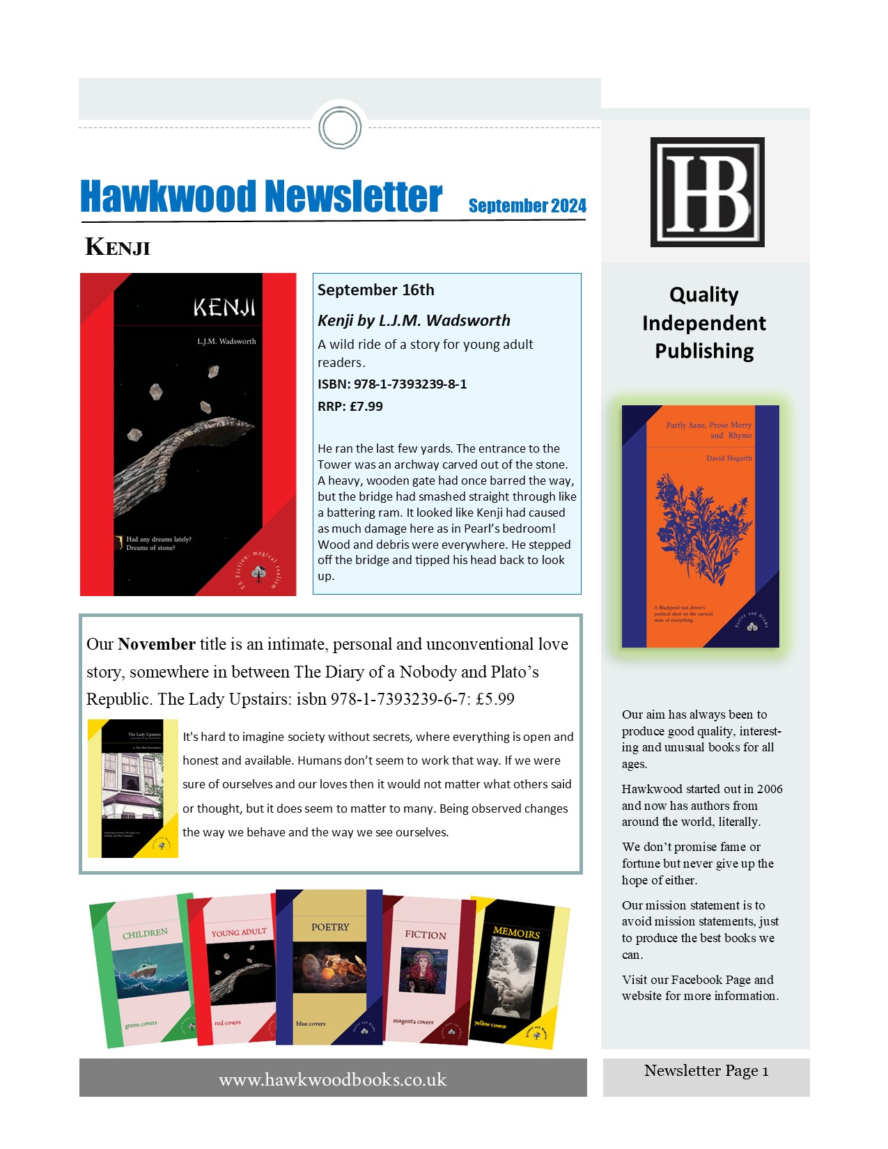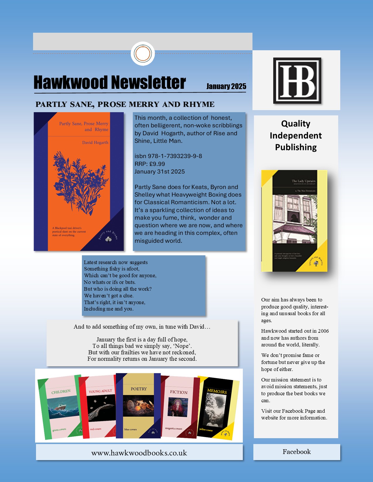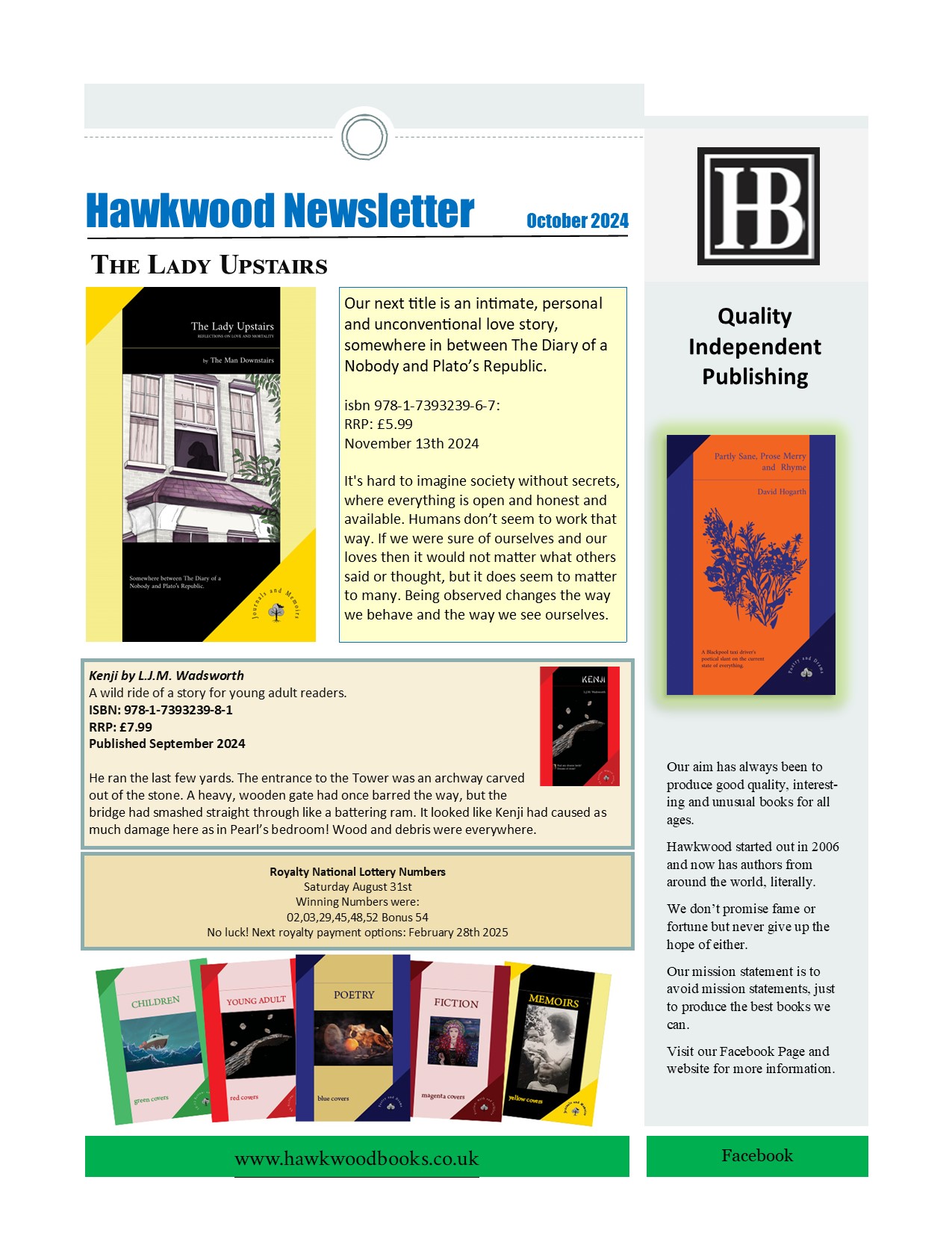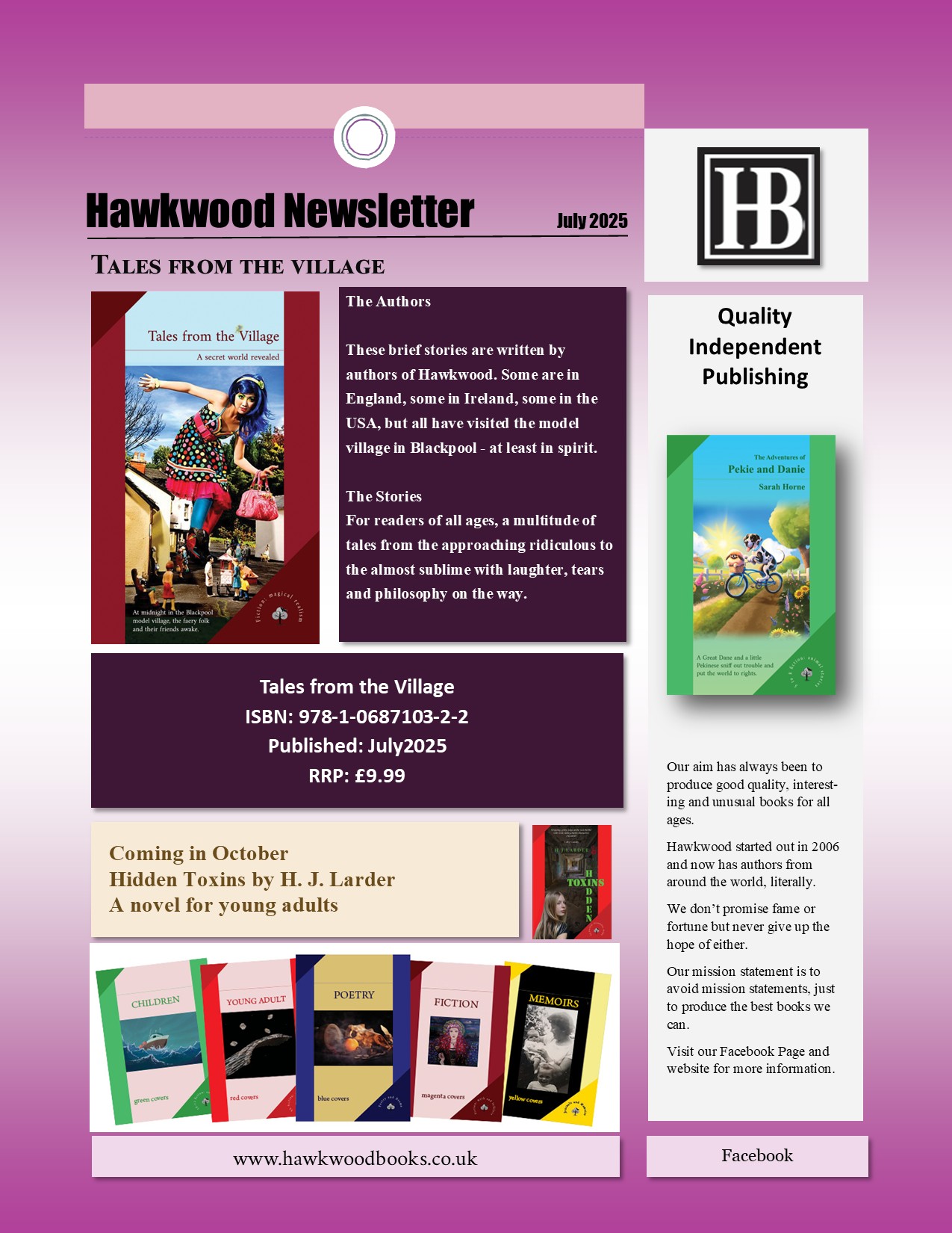 Most current news is now updated on the Hawkwood Books Facebook Page. We don't have Instagram or TikTok and even Facebook is a trial. We still have newsletters as and when appropriate. Some of these are shown below. There may also be some older, bordering on prehistoric, images in the media section. I would, of course, love to be announcing launches in the London Hilton, the O2 Arena or an international event or two, but those newsletters are yet to come. Thank you for looking. | ||||||